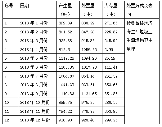 飛灰暫存場(chǎng)所內(nèi)堆放的飛灰螯合物經(jīng)浸出毒性檢測(cè),達(dá)到《生活垃圾填埋場(chǎng)污染控制標(biāo)準(zhǔn)》(GB16889-2008)中規(guī)定的要求,方可進(jìn)入交付運(yùn)輸環(huán)節(jié)。飛灰螯合物交由獲得《危險(xiǎn)廢物經(jīng)營(yíng)許可證》的單位進(jìn)行轉(zhuǎn)移至濱海生活垃圾衛(wèi)生填埋場(chǎng)。